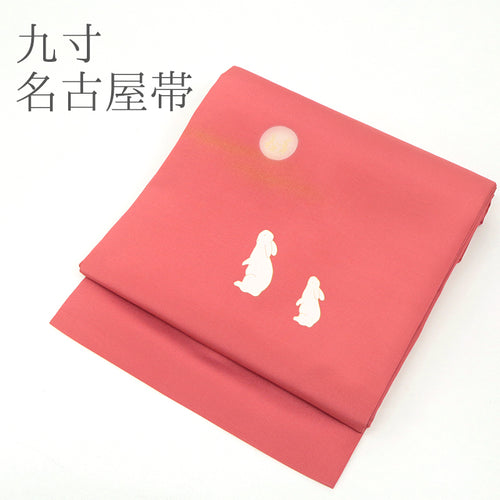 名古屋帯 濃いピンクにお月見うさぎ ウサギの餅つき ( ローズピンク )