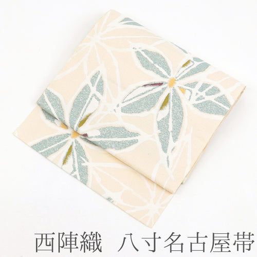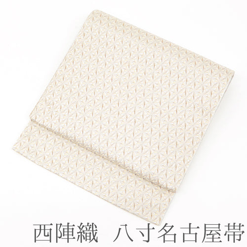 名古屋帯 西陣織 八寸 麻の葉模様 幾何学文様 アイボリー