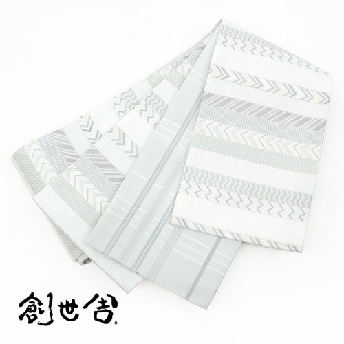半幅帯 ホワイト 大きいサイズ 長尺 《 創世舎 》 薄グレー 白地 シェブロンストライプ 小紋縞 / 薄グレー 細格子 リバーシブル半巾帯