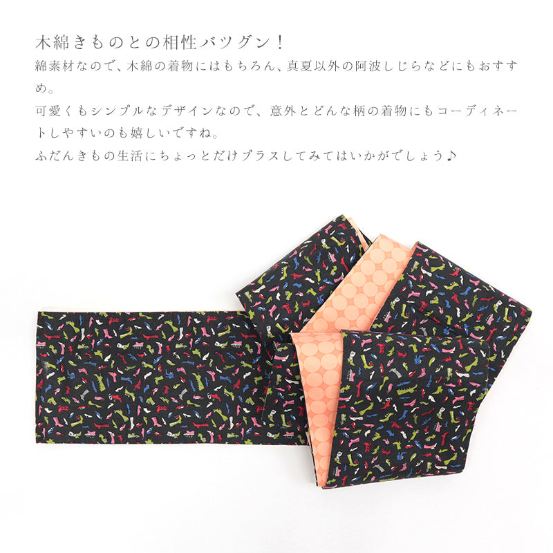 綿素材なので、木綿の着物にはもちろん、真夏以外の阿波しじらなどにもおすすめ。可愛くもシンプルなデザインなので、意外とどんな柄の着物にもコーディネートしやすいのも嬉しいですね。