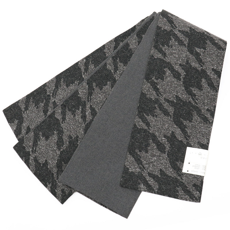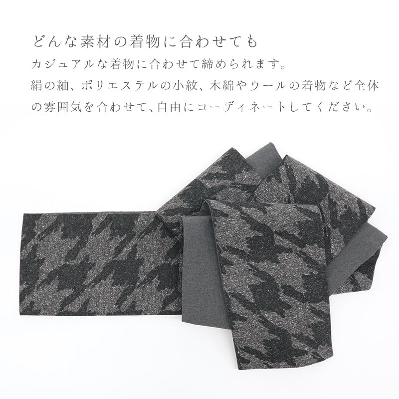 カジュアルな着物に合わせて締められます。絹の紬、ポリエステルの小紋、木綿やウールの着物など