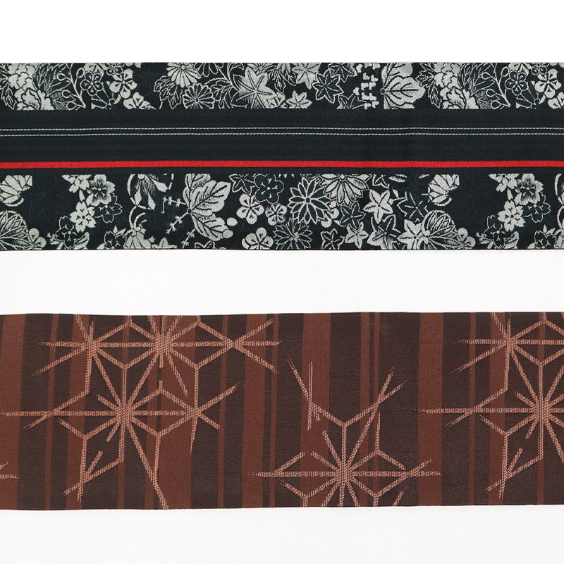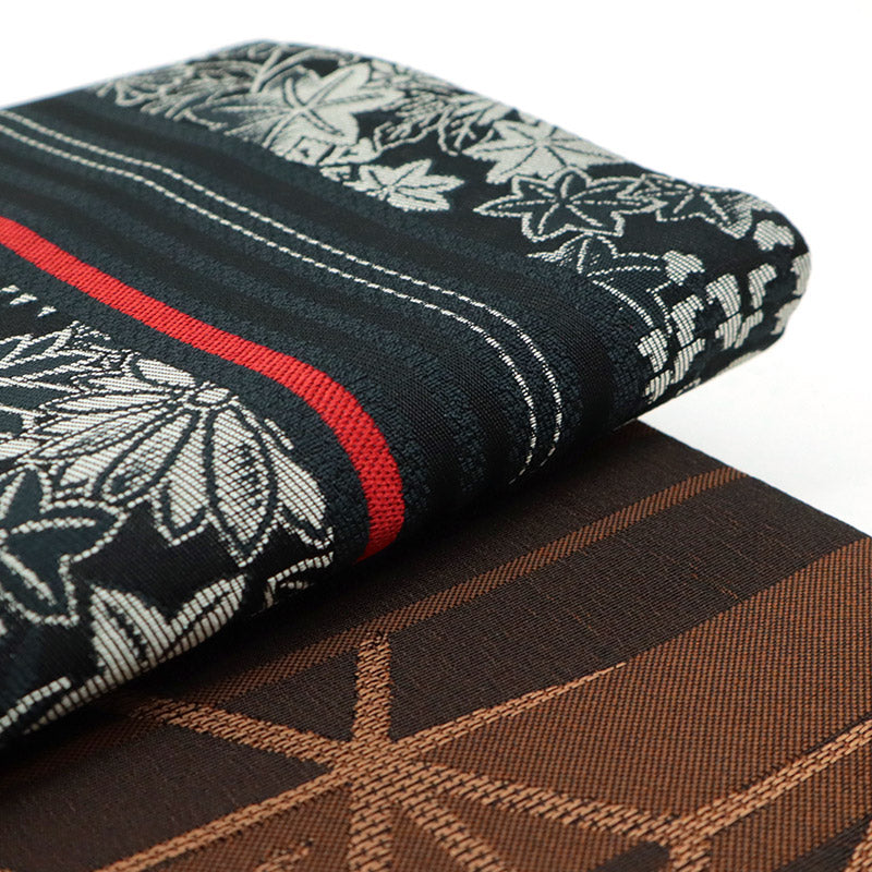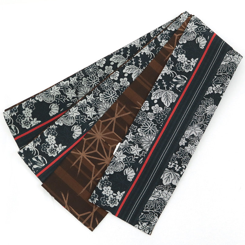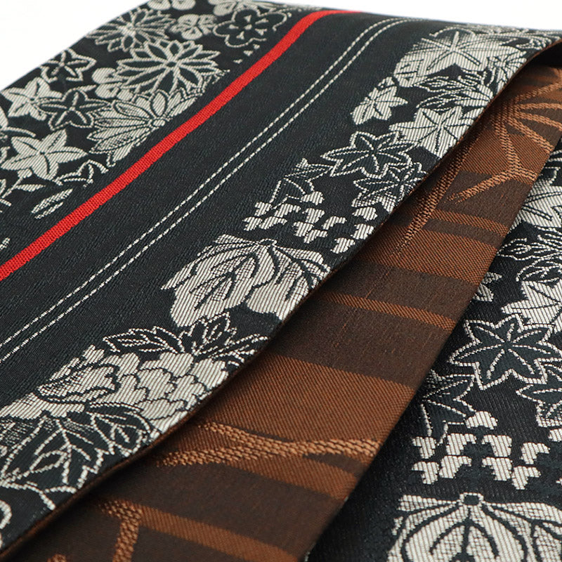 《創世舎》 リバーシブル半巾帯 長尺 ブラック地に赤ライン 紅葉桜葵菊桐梅 / 赤茶縞にやぶれ麻の葉 ブラウン