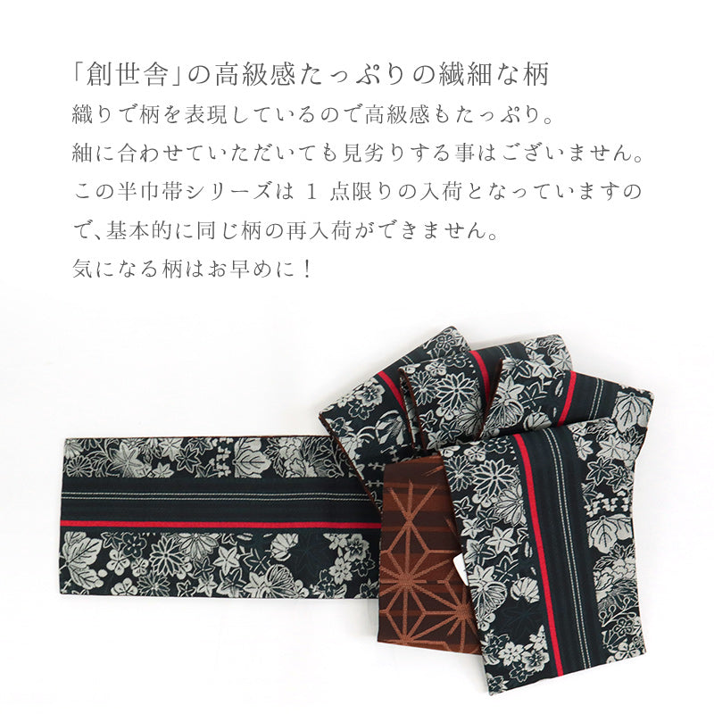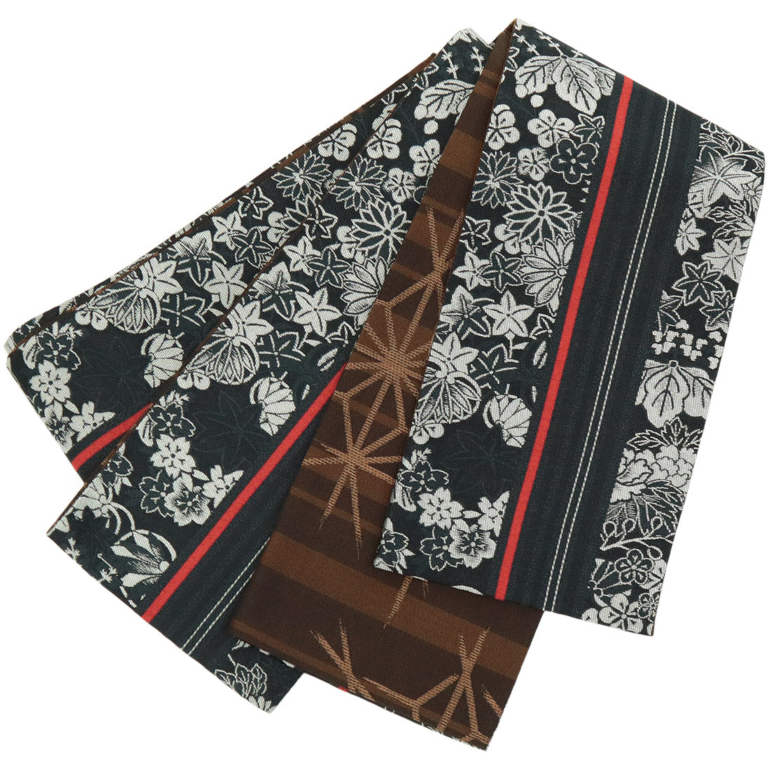 《創世舎》 リバーシブル半巾帯 長尺  ブラック地に赤ライン 紅葉桜葵菊桐梅 / 赤茶縞にやぶれ麻の葉 ブラウン
