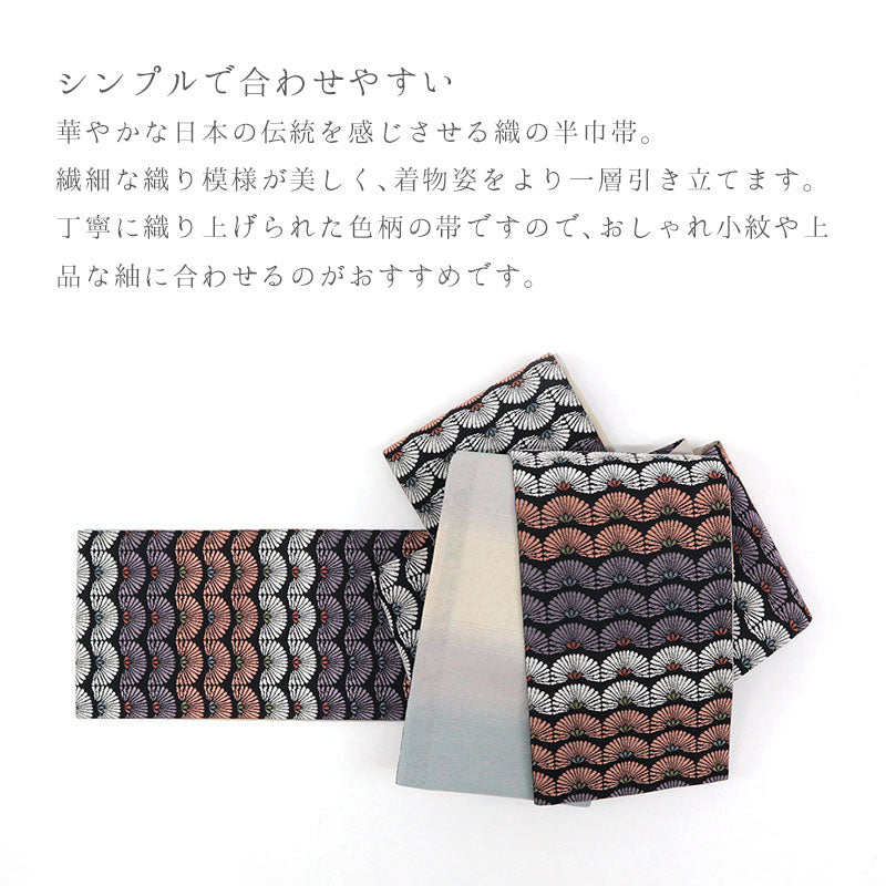 小紋や紬などに合わせられる半巾帯ですが、しっかりとした織の柄付けがされていますので、優雅で格式高い雰囲気を醸し出しています。