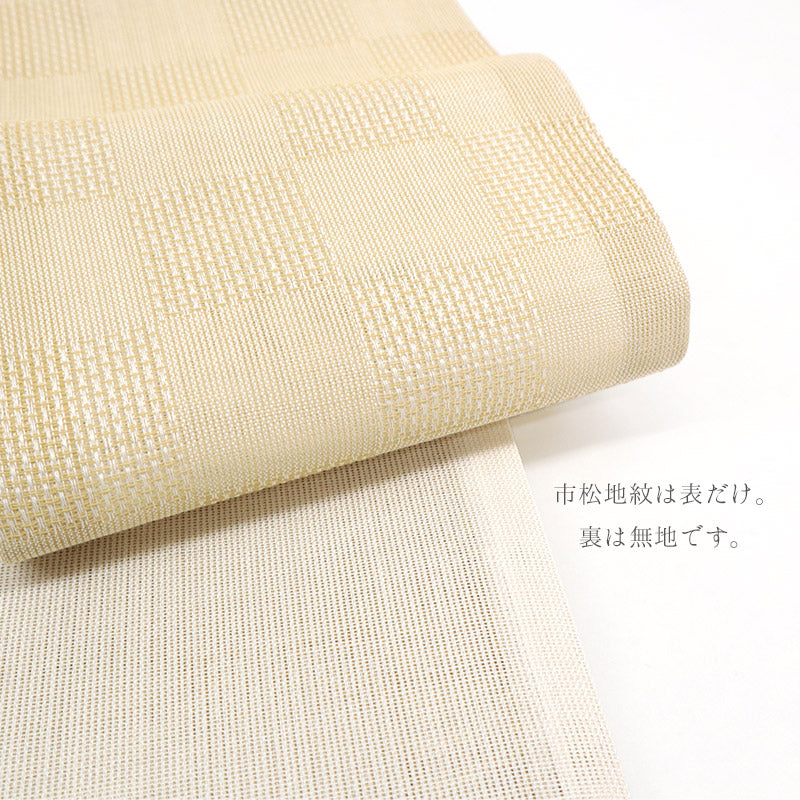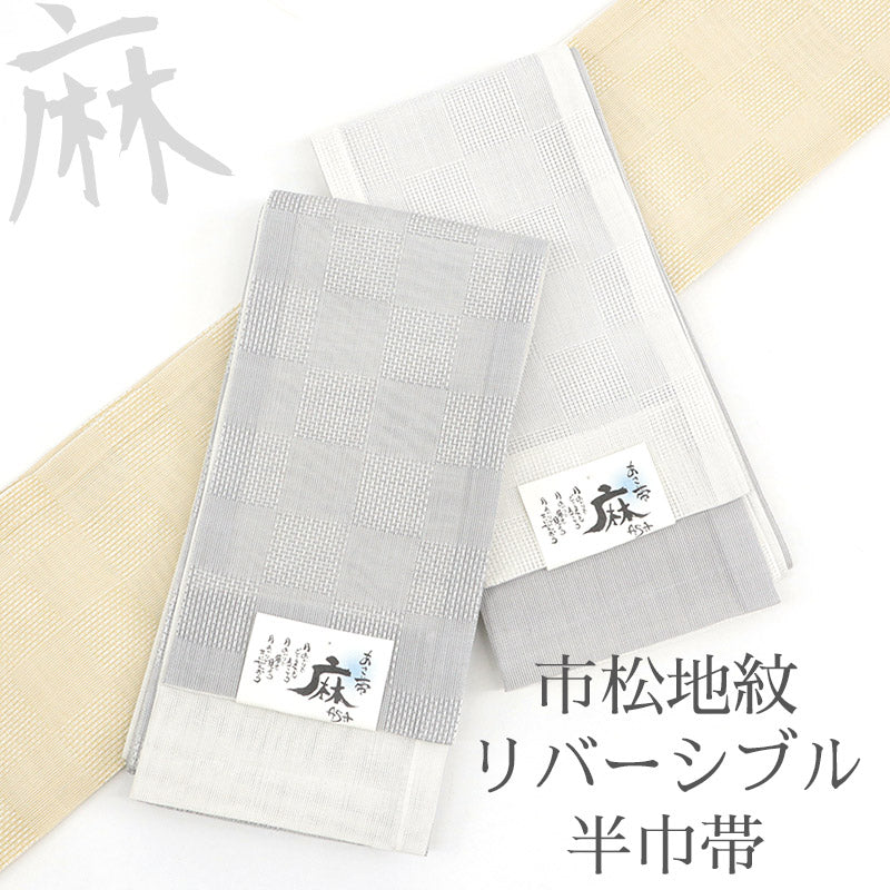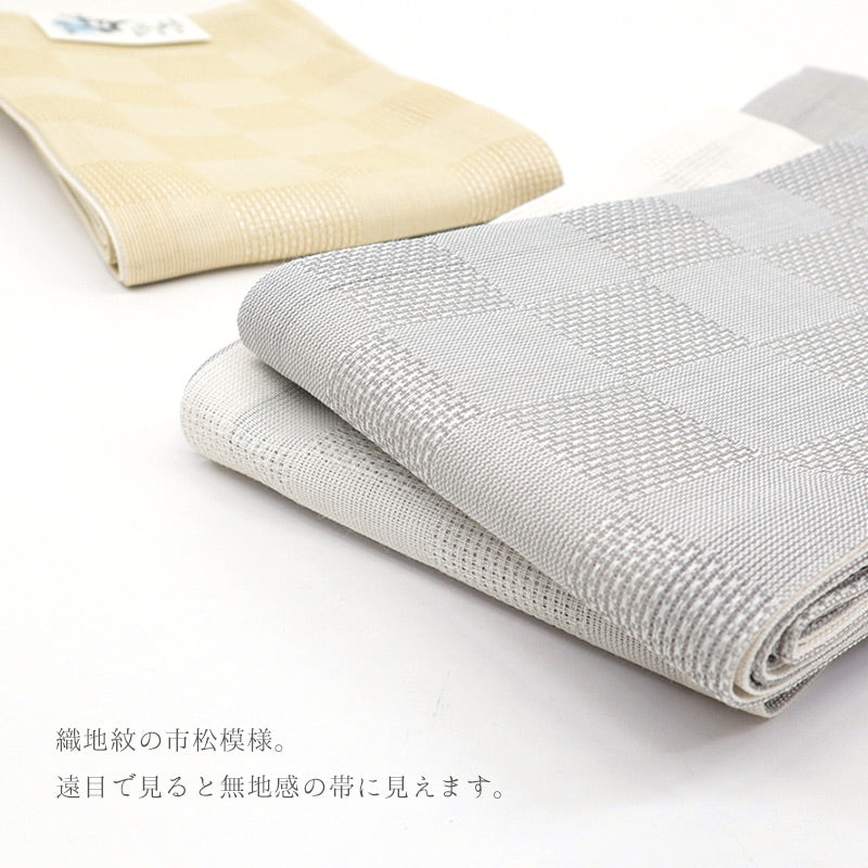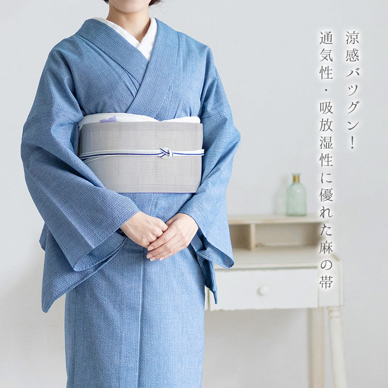 麻素材の帯は真夏(6〜8月)の間とされています。天然繊維の中で、もっとも涼しいと言われる麻の爽やかさを是非お楽しみください!