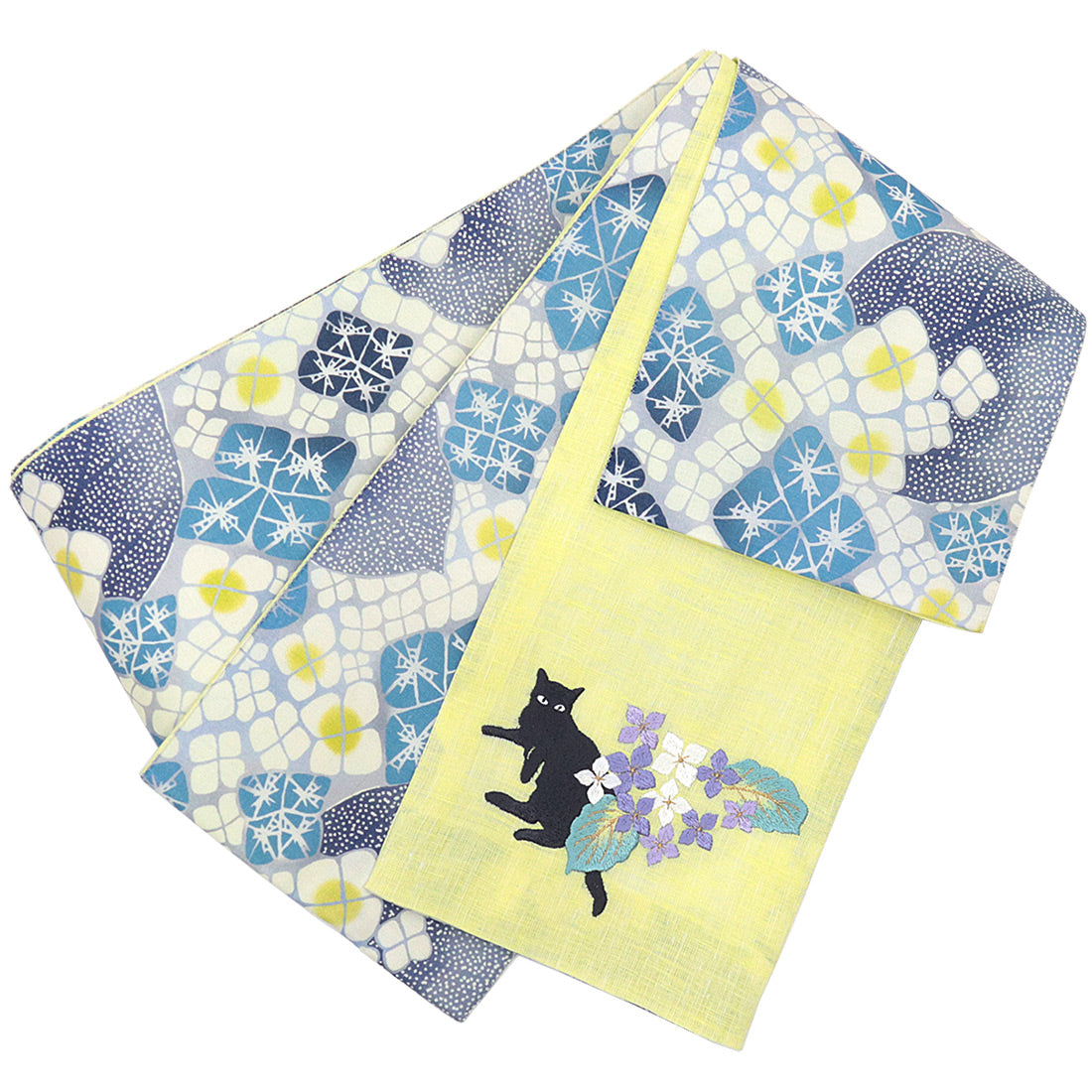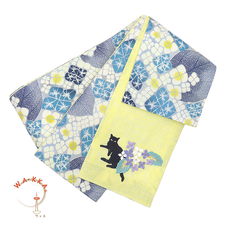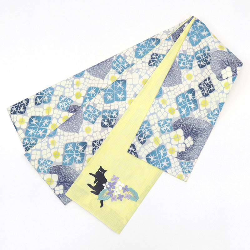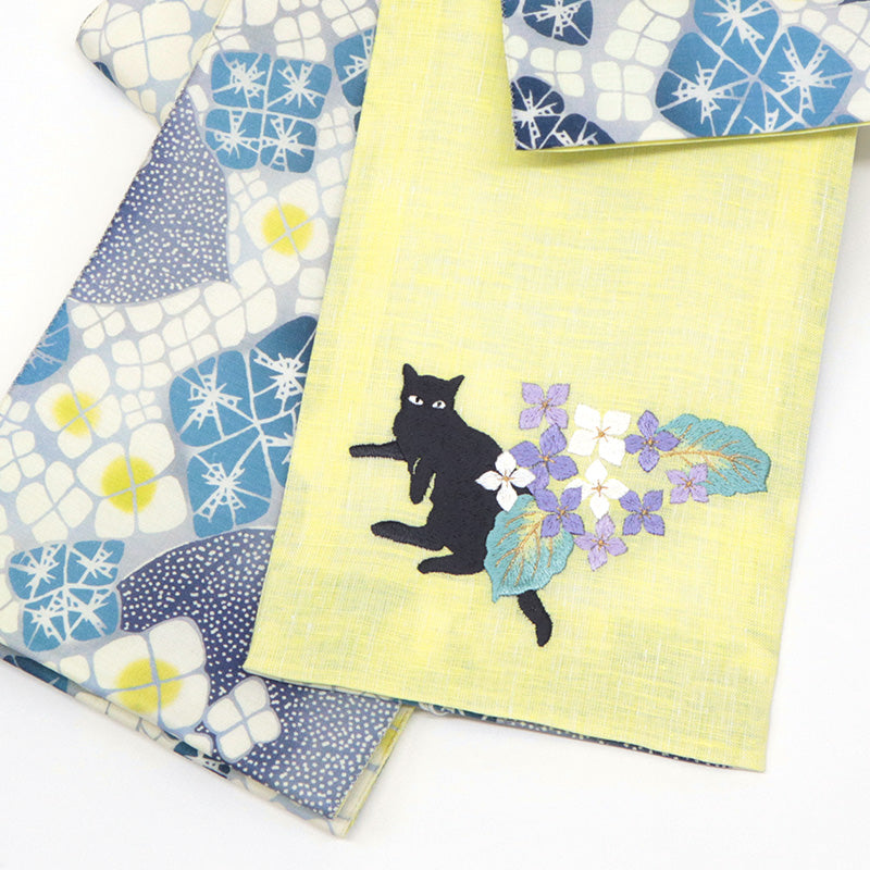 裏側の無地感柄には手先と胴の部分に来る部分に黒猫とあじさいの刺繍が。