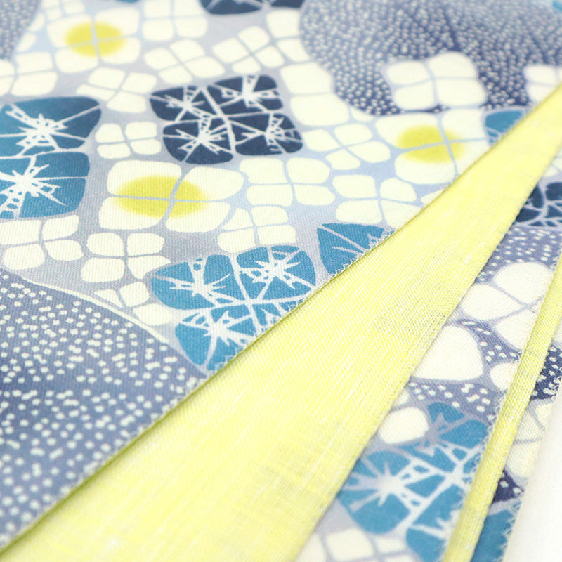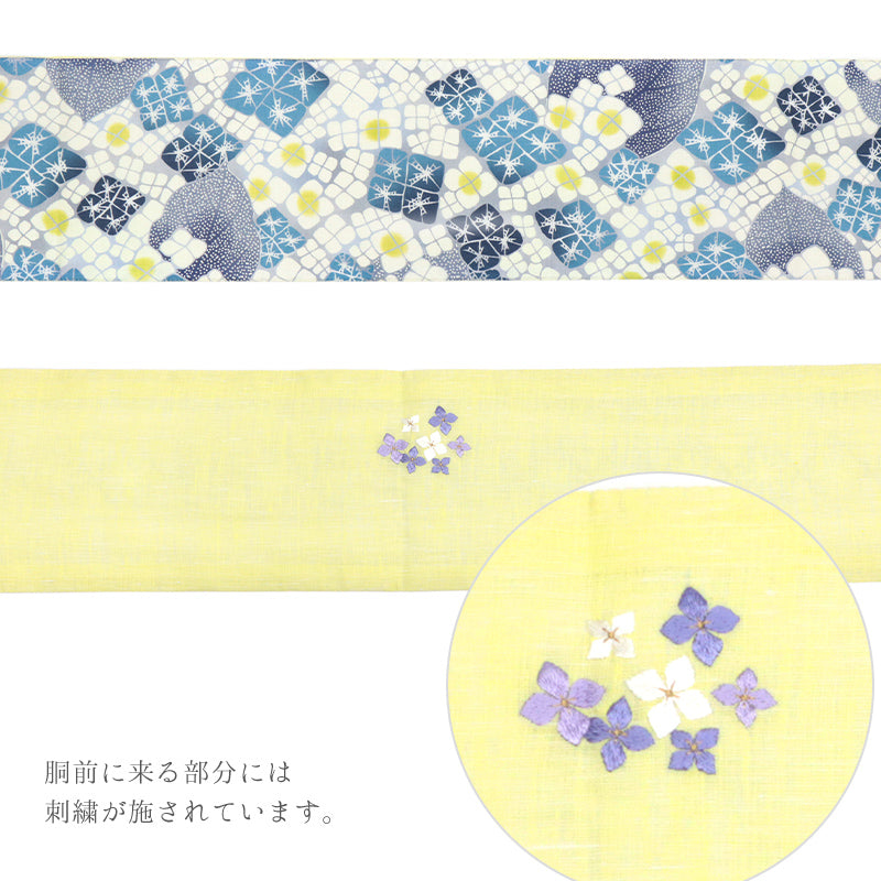 濃淡のある花、ぼかしの入った花など、同じ花がないぐらい、彩り豊かなあじさいが咲き誇ります。。浴衣にもぜひ合わせていただきたい柄ゆきです。