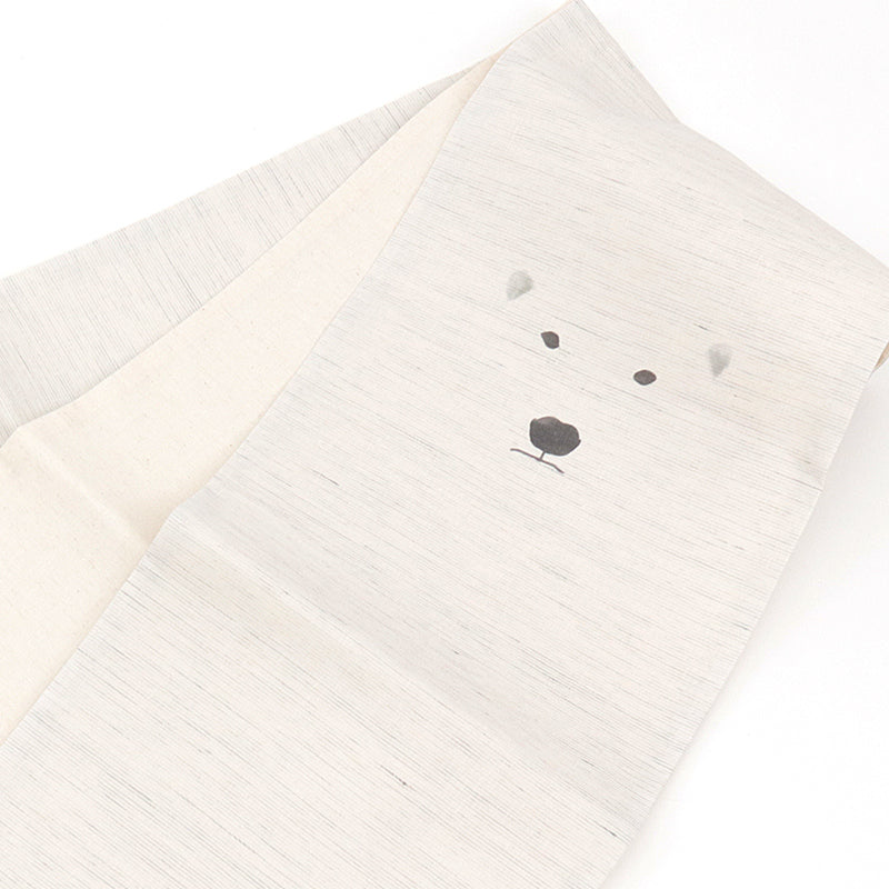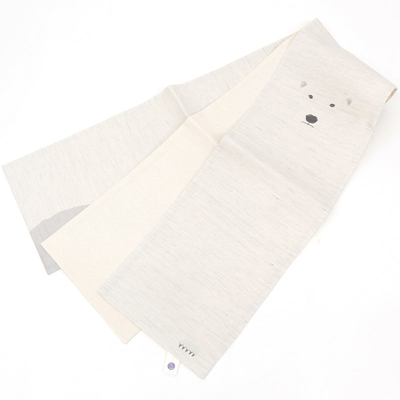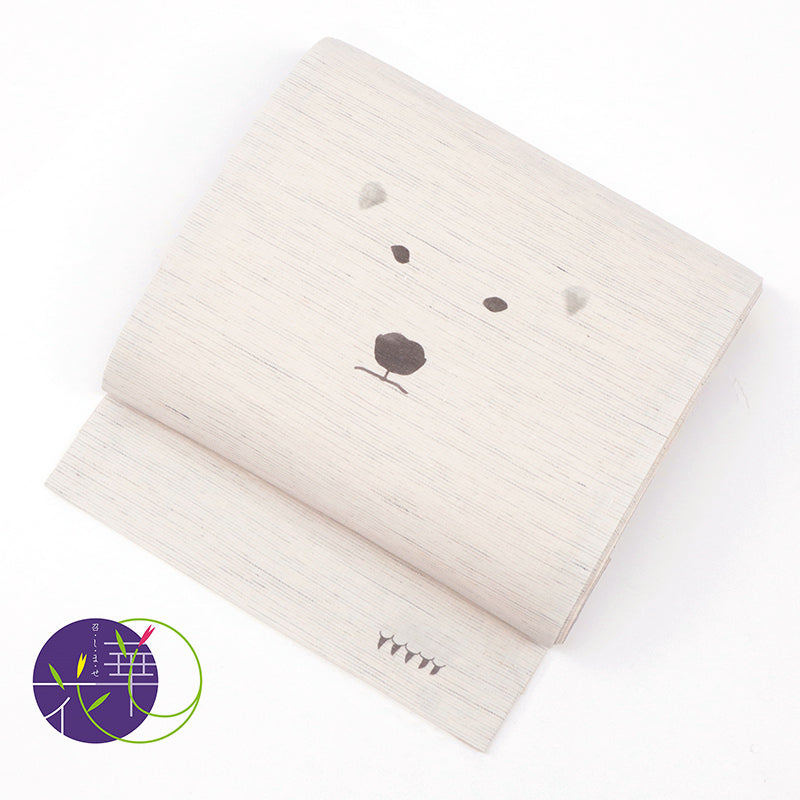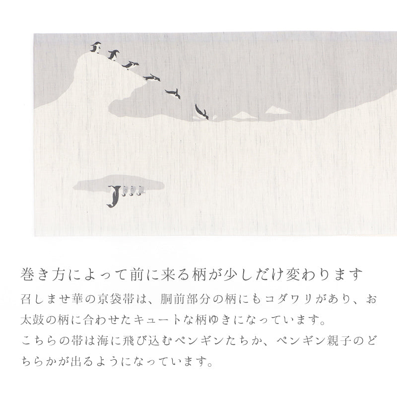 麻 帯 京袋帯 白《召しませ華》お仕立て上がり 京袋帯 染め帯 全通お太鼓柄 ホワイトグレー 地球の裏側 白くま ペンギン ホワイト
