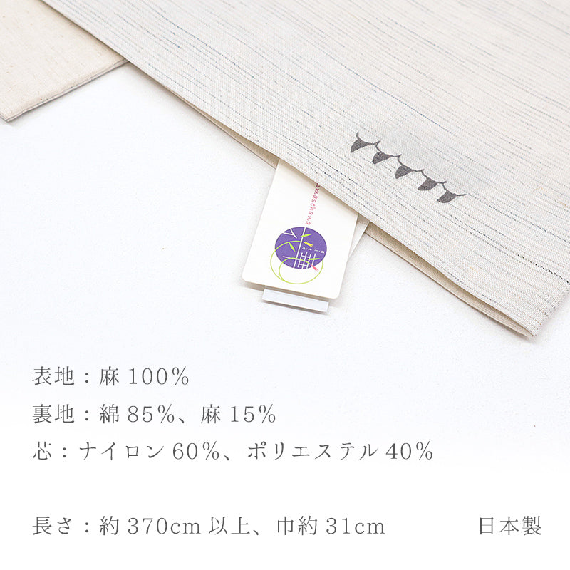 麻独特のフシだった素材感を裏地に残し、表は滑らかな麻を100%使用した帯です。