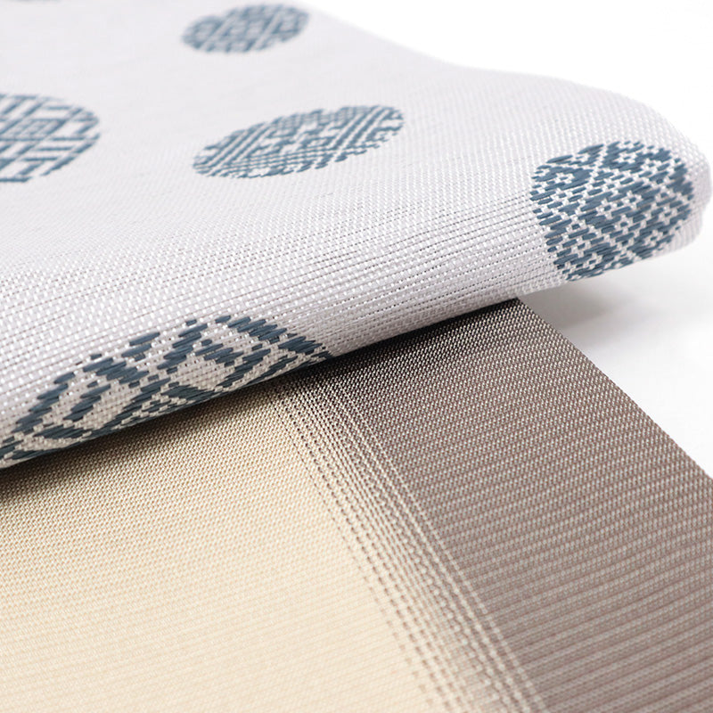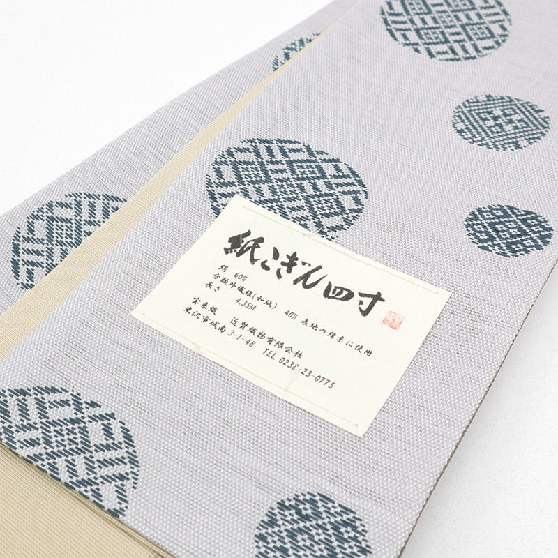 「紙こぎん」とは、青森・津軽地方の伝統刺し子「こぎん刺し」の模様をもとに、和紙糸を織り込んで表現した織物です。本品では、表地の緯糸に和紙糸を40%使用し、こぎん刺しを思わせる幾何学模様を織り出しています。