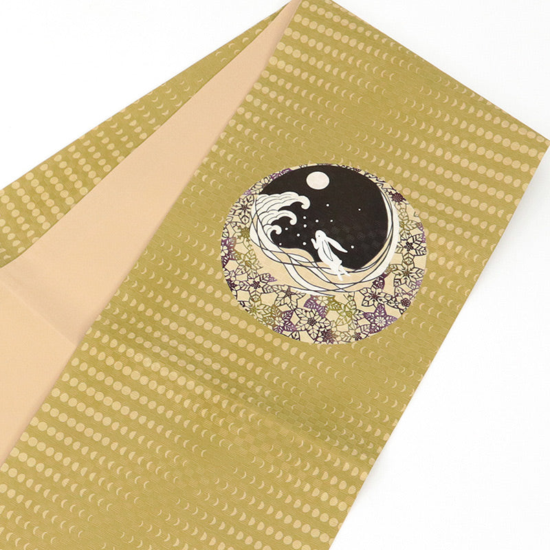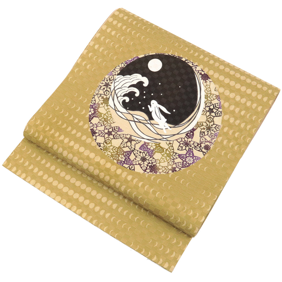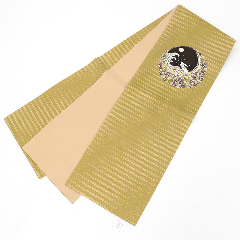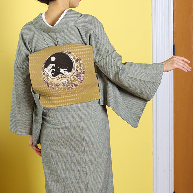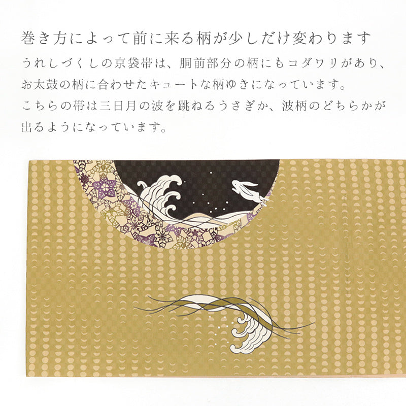 月明かりに照らされた夜の情景を表現した、正絹の京袋帯です。中央には、満月と寄せる波、その中に跳ねる兎の姿が描かれ、古くから親しまれてきた「月と兎」の物語を思わせる趣ある意匠。