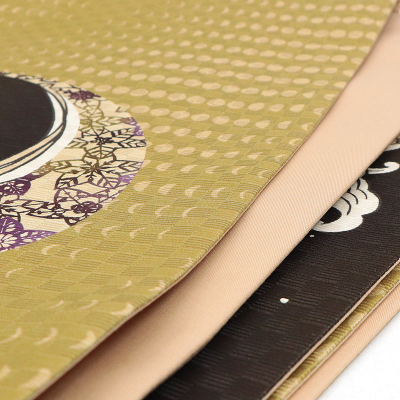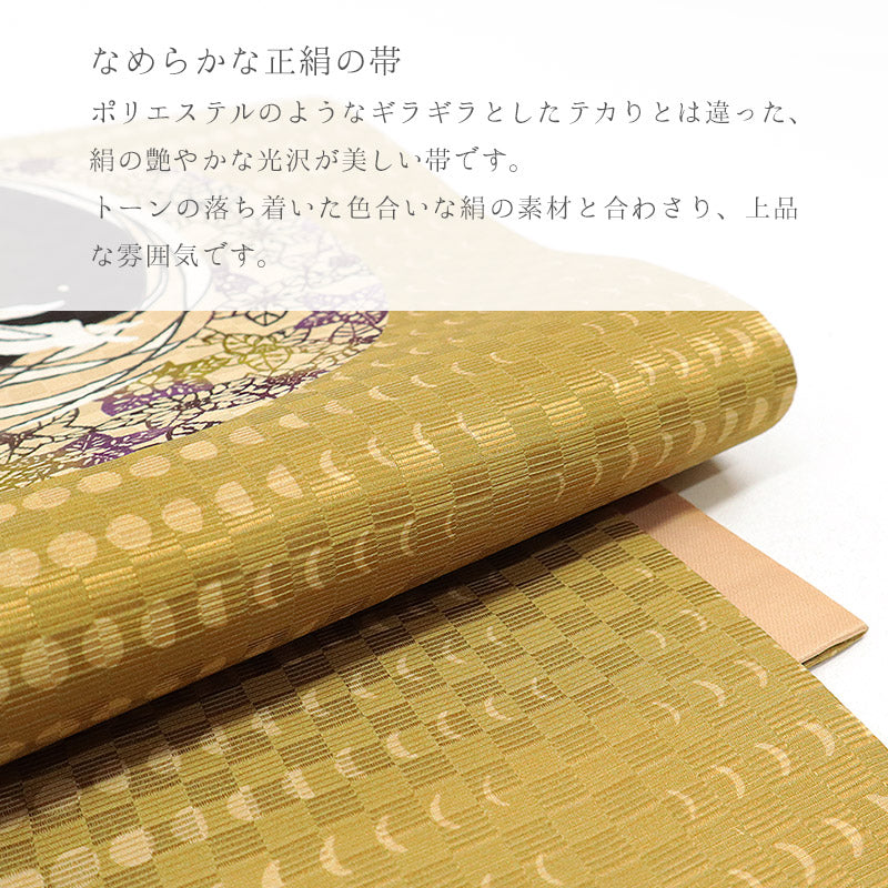 ポリエステルのようなギラギラとしたテカりとは違った、絹の艶やかな光沢が美しい帯です。トーンの落ち着いた色合いは絹の素材と合わさり、上品な雰囲気です。