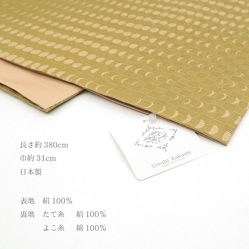 地色は落ち着きのある黄土色系で、全体に連なる月の満ち欠け文様が奥行きを添え、季節を問わず幅広い着こなしに活かせる一本です。