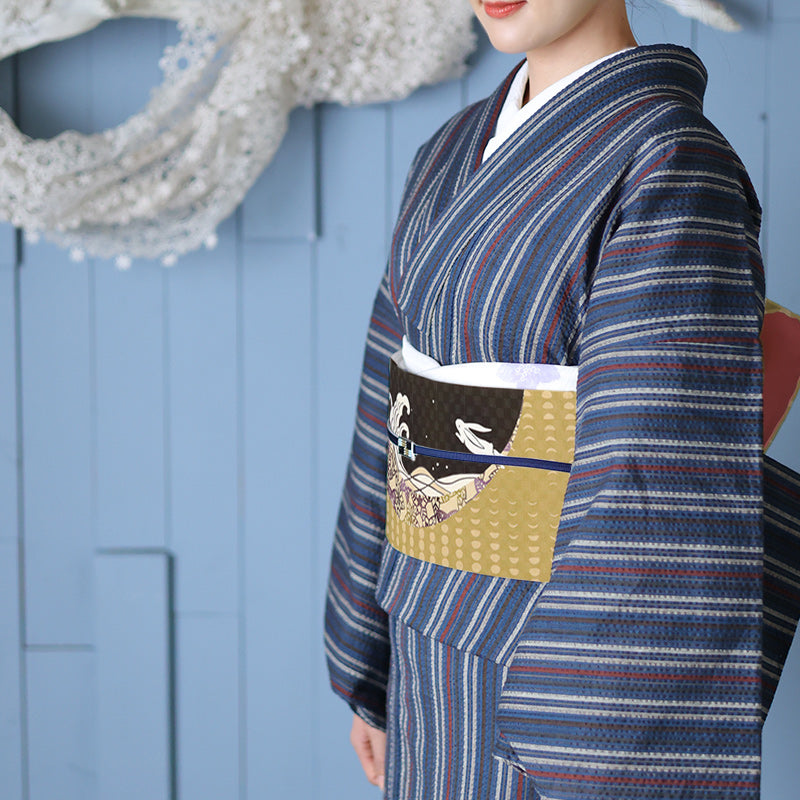 紬、絣、黄八丈、銘仙などの普段着から小紋、お召し、更紗などのお出かけに着るような着物に合わせてお召しいただけます。正絹、木綿、ウール、ポリエステルなどの洗える着物、と素材は気にせず何にでも合わせられますので、使い勝手のよい一本になること間違いなしです。