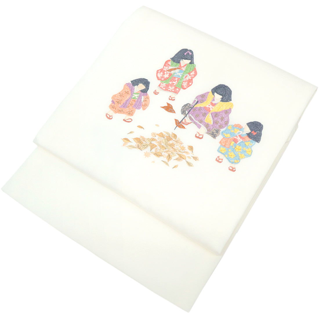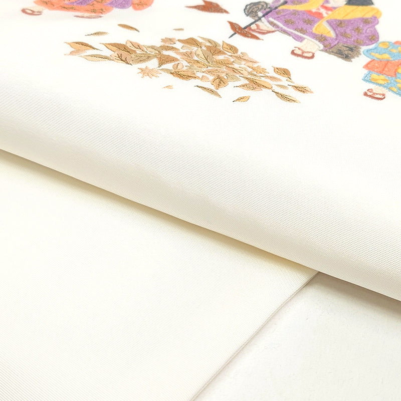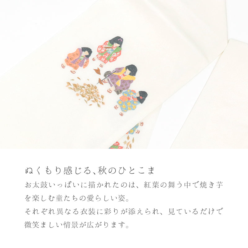 お太鼓いっぱいに描かれたのは、紅葉の舞う中で焼き芋を楽しむ童たちの愛らしい姿。それぞれ異なる衣装に彩りが添えられ、見ているだけで微笑ましい情景が広がります。