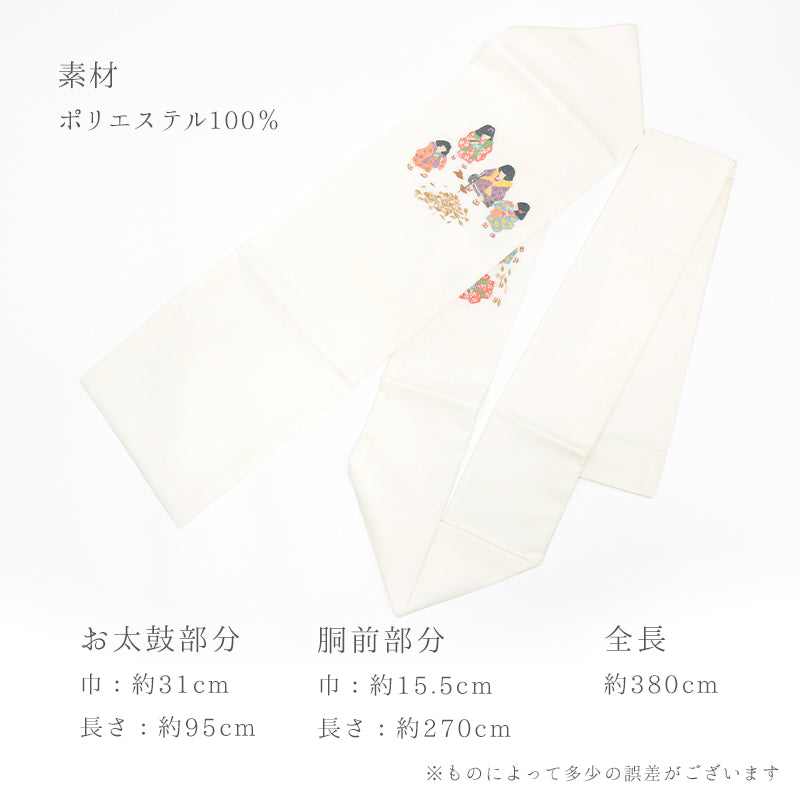 | サイズ | お太鼓巾:約31cm、お太鼓長さ:約95cm、胴前巾:約15.5cm、全長約380cm |