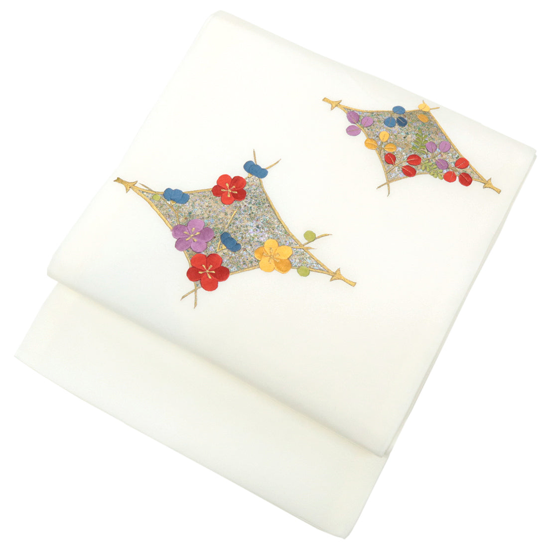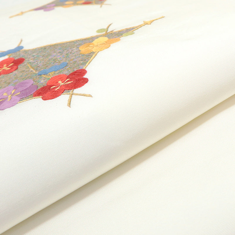 白地に映える松葉菱の中へ、紅・紫・黄・青の梅をあしらった優雅な意匠。松と梅という吉祥の組み合わせは、長寿や幸福を象徴し、装いに格調を添えます。
