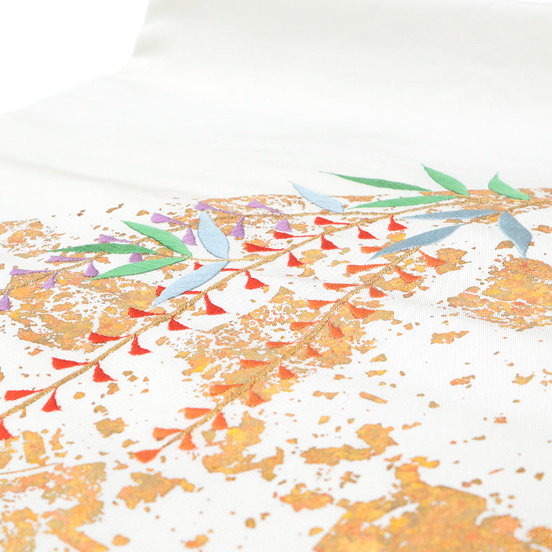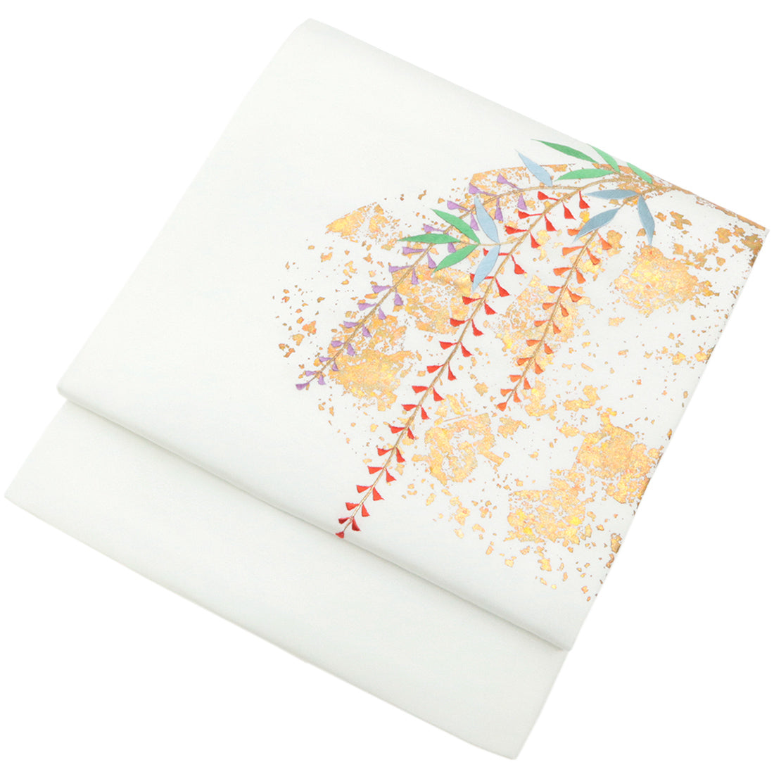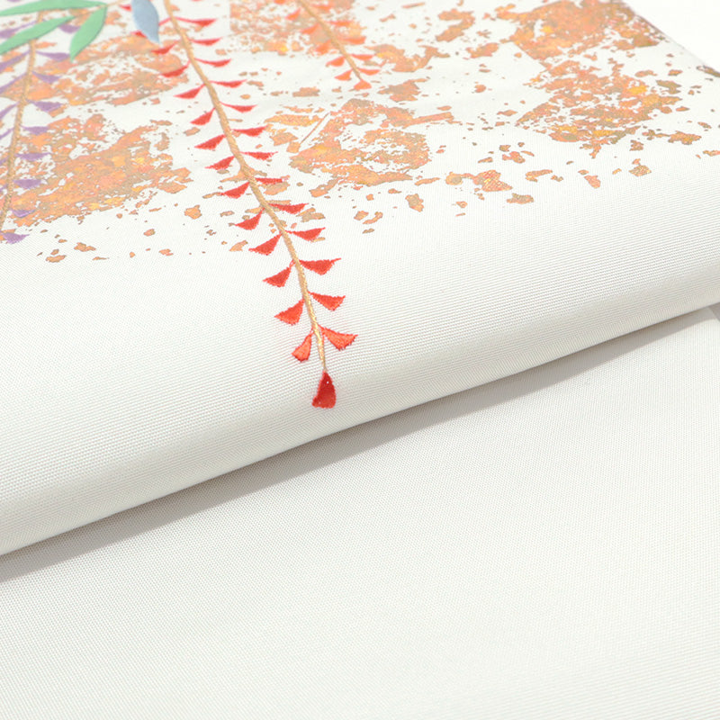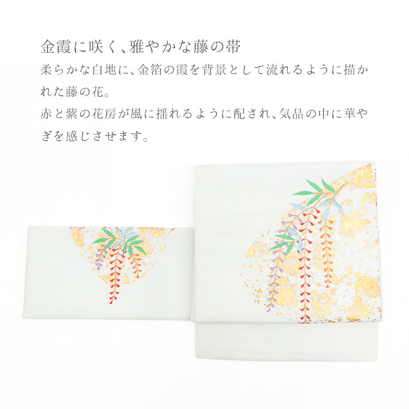 柔らかな薄グレー地に、金箔の霞を背景として流れるように描かれた藤の花。赤と紫の花房が風に揺れるように配され、気品の中に華やぎを感じさせます。