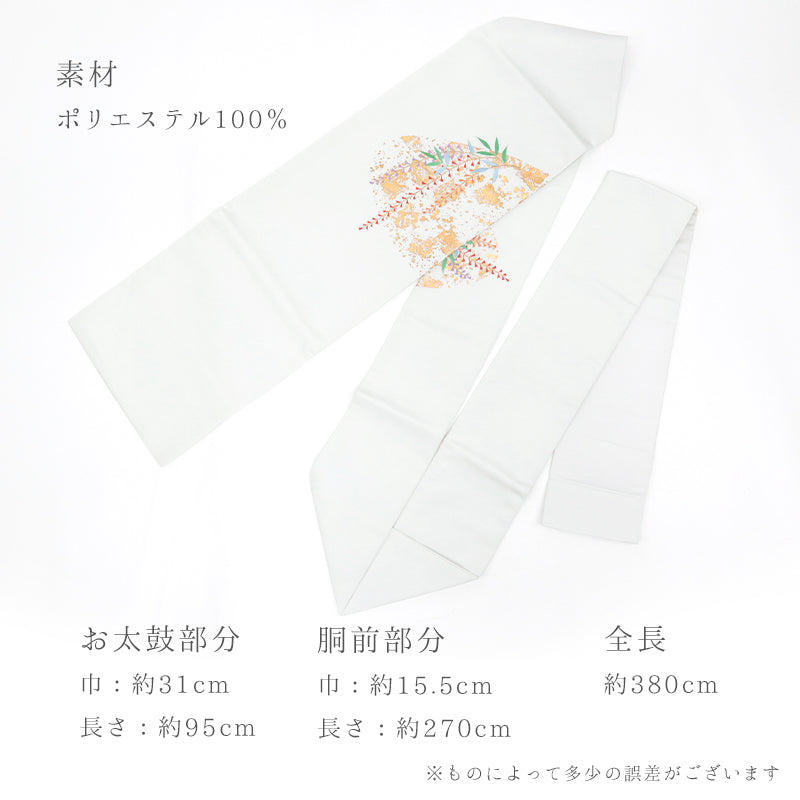 | サイズ | お太鼓巾:約31cm、お太鼓長さ:約95cm、胴前巾:約15.5cm、全長約380cm |