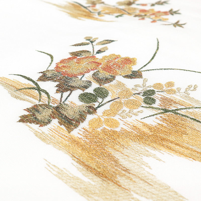無地に浮かぶ、梅・牡丹・萩の花々。金糸の霞が上品に流れ、四季の美を一枚に閉じ込めたような華やかさです。