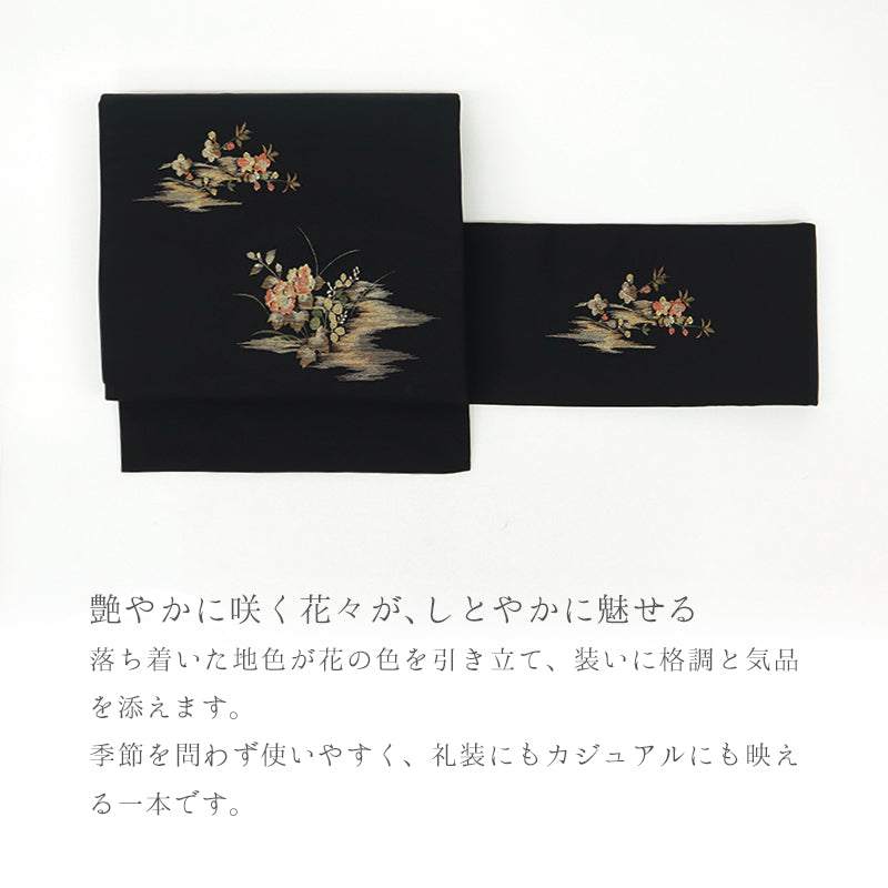 お太鼓と胴前に柄を配したデザインで、締めた際のバランスが美しく決まります。無地感覚でも合わせやすく、幅広い装いにお使いいただけます。