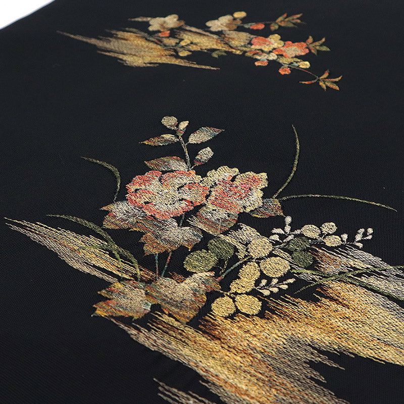 落ち着いた地色が花の色を引き立て、装いに格調と気品を添えます。