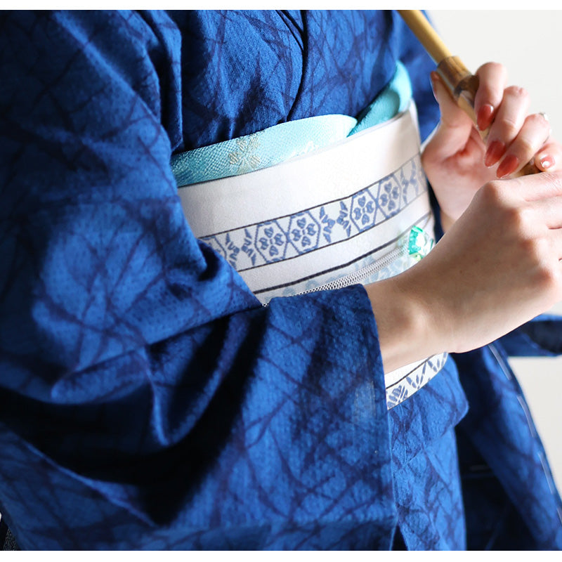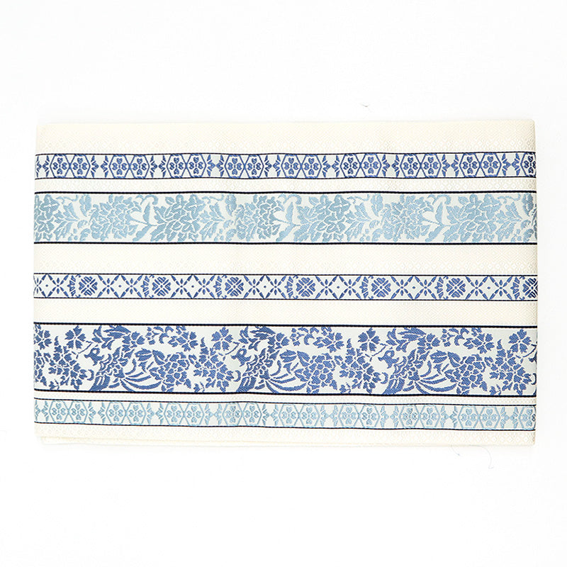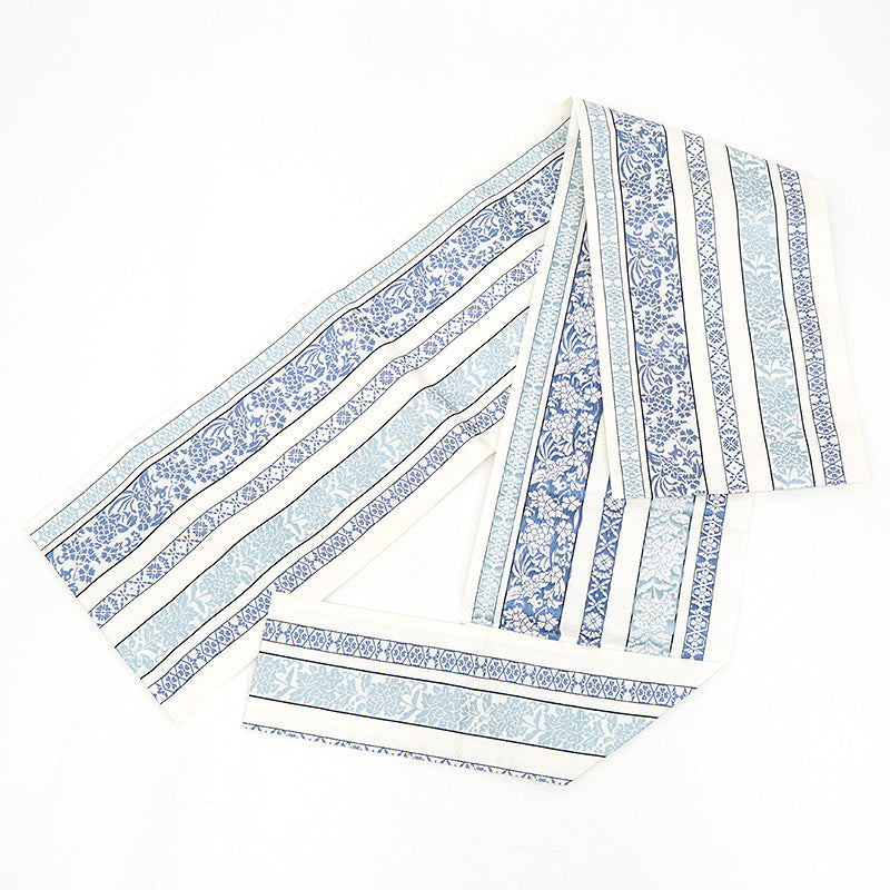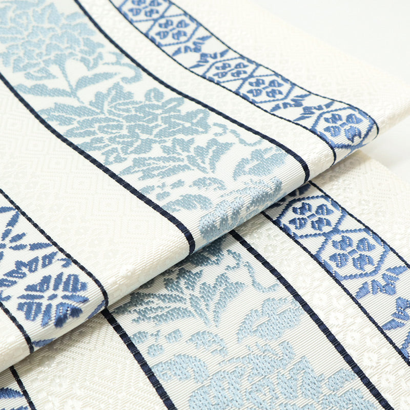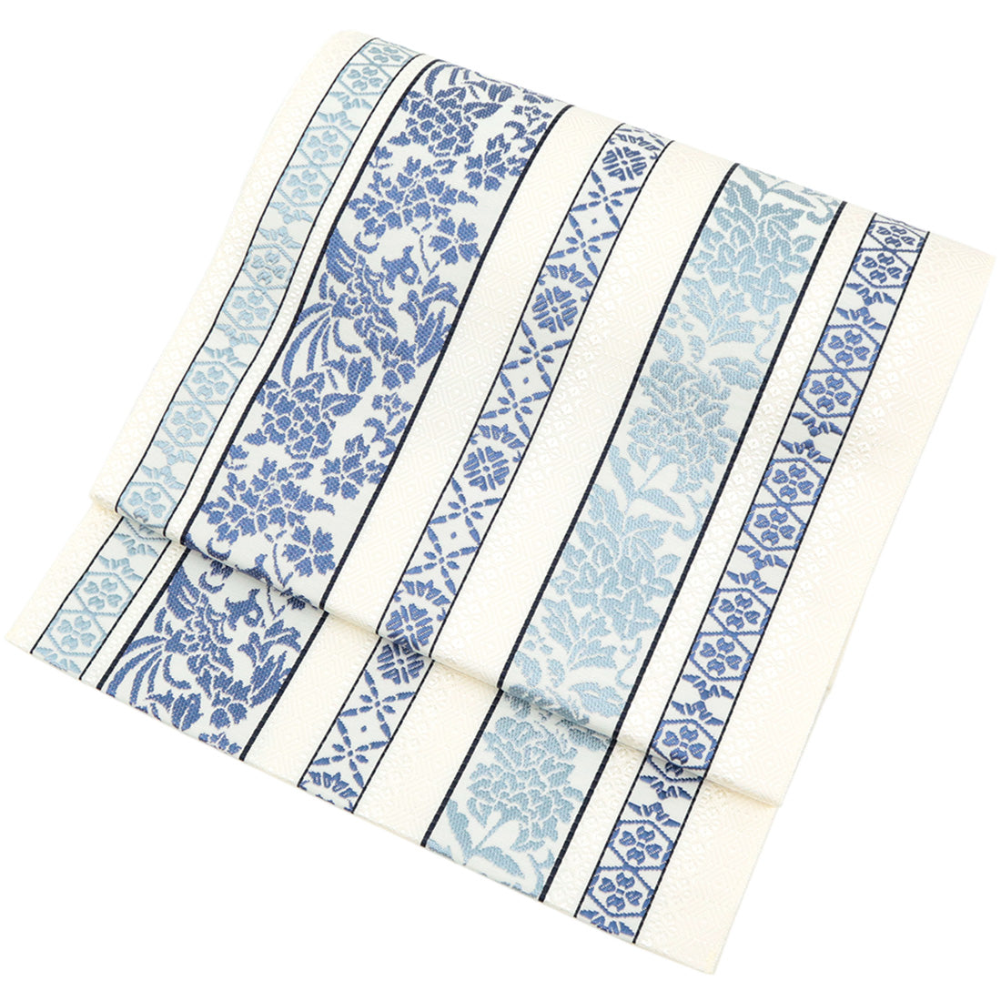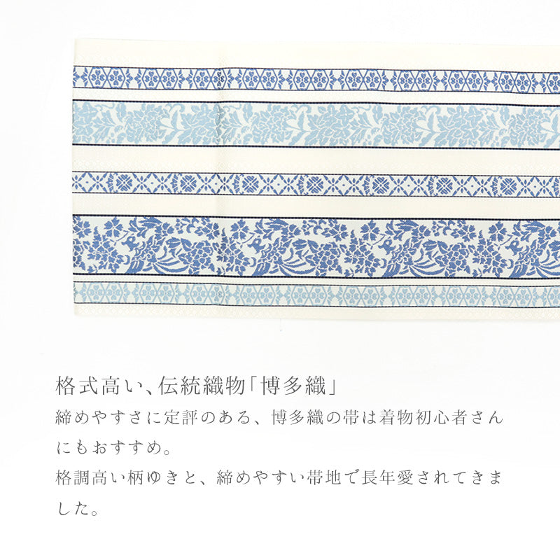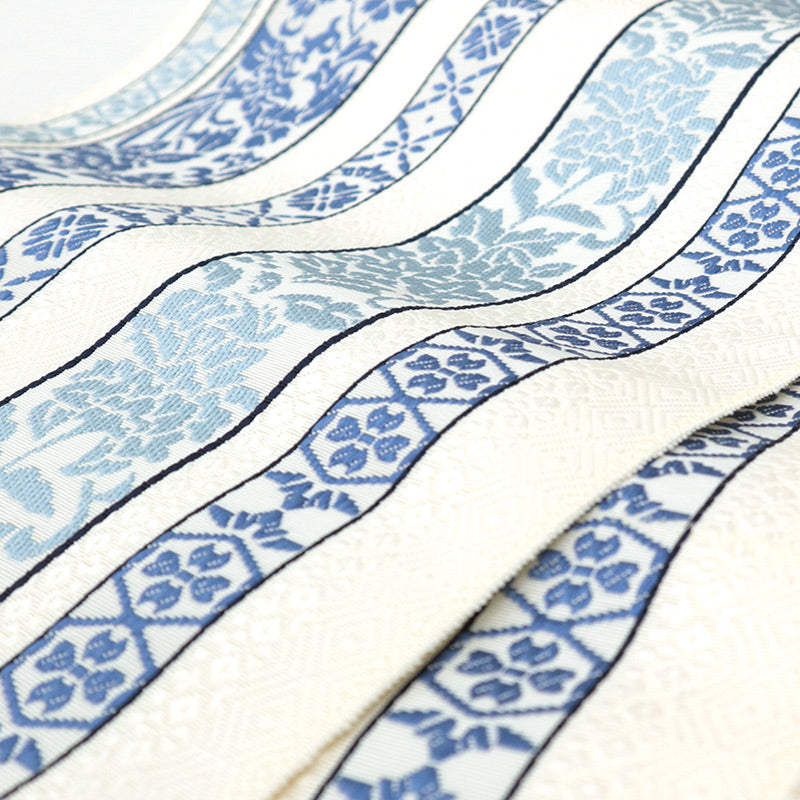 白地のベースに青や水色で牡丹や撫子が差し込まれた、現代モダンの献上柄。伝統献上を思わせる縞構成に、幾何文様を差し込んだ創作柄は博多らしい上品さが漂います。