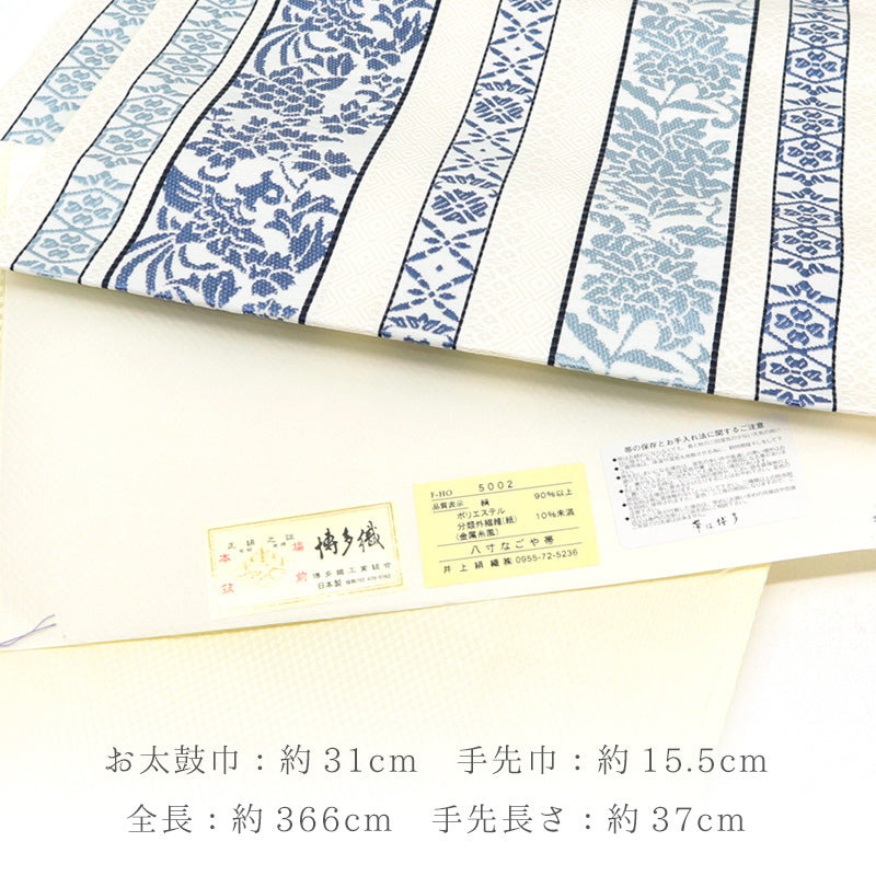 | サイズ | お太鼓巾:約31cm 全長:約366cm 手先巾:約15.5cm 手先長さ:約37cm |