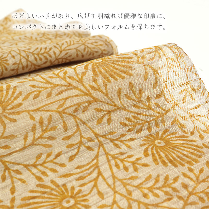 ほどよいハリがあり、広げて羽織れば優雅な印象に、コンパクトにまとめても美しいフォルムを保ちます。