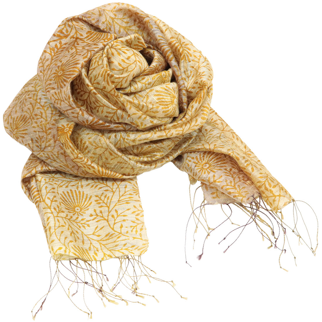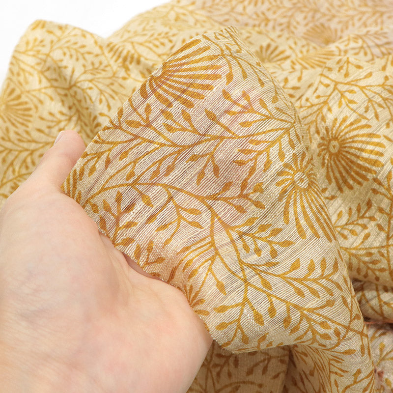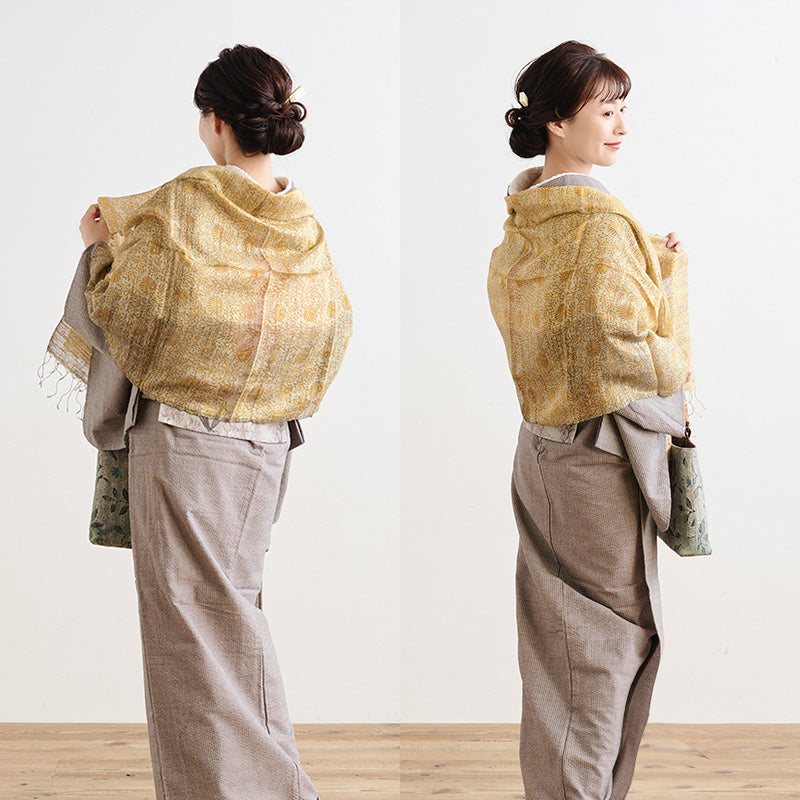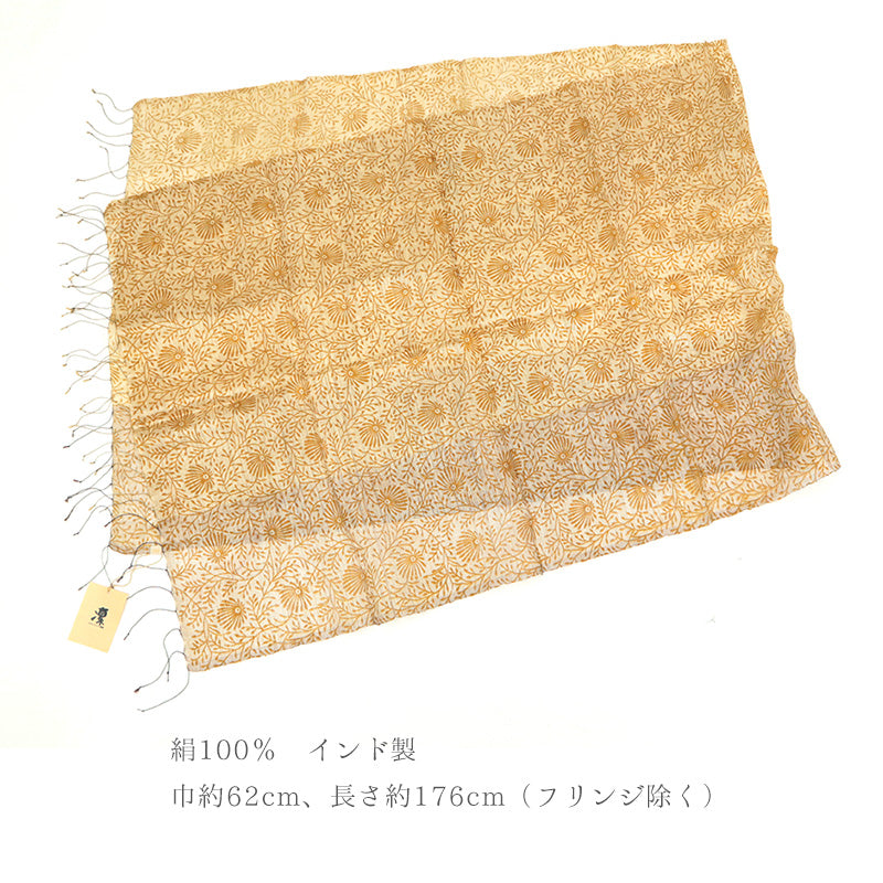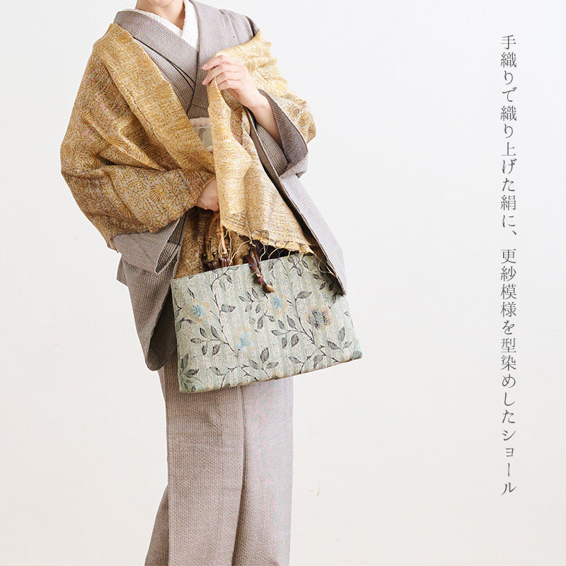 手織りで織り上げた絹に、更紗模様を型染めしたショールです。ざっくりとした風合いのシルク生地に型染めを施すことで、奥行きのある独特の質感に仕上がっています。