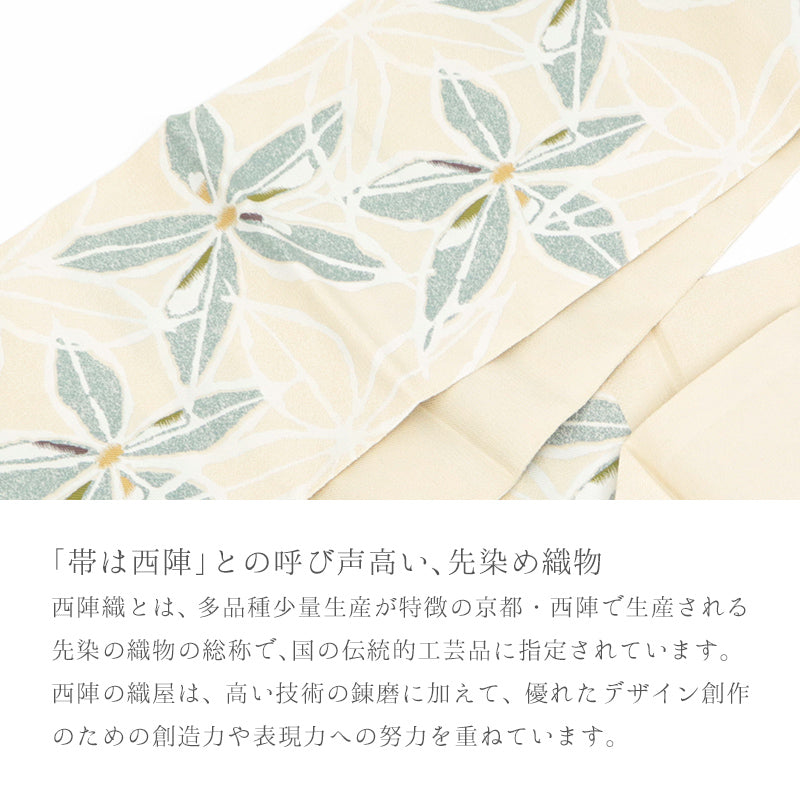 カジュアルなお着物にピッタリな西陣織を使用した九寸名古屋帯です。一般的な名古屋仕立てですので、着付け初心者の方にもオススメです。