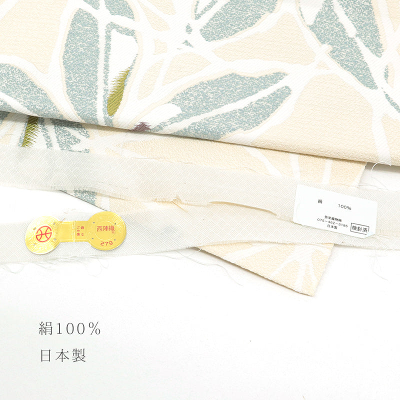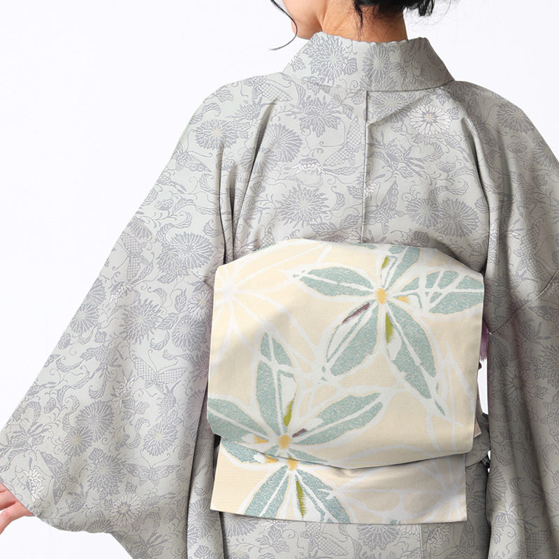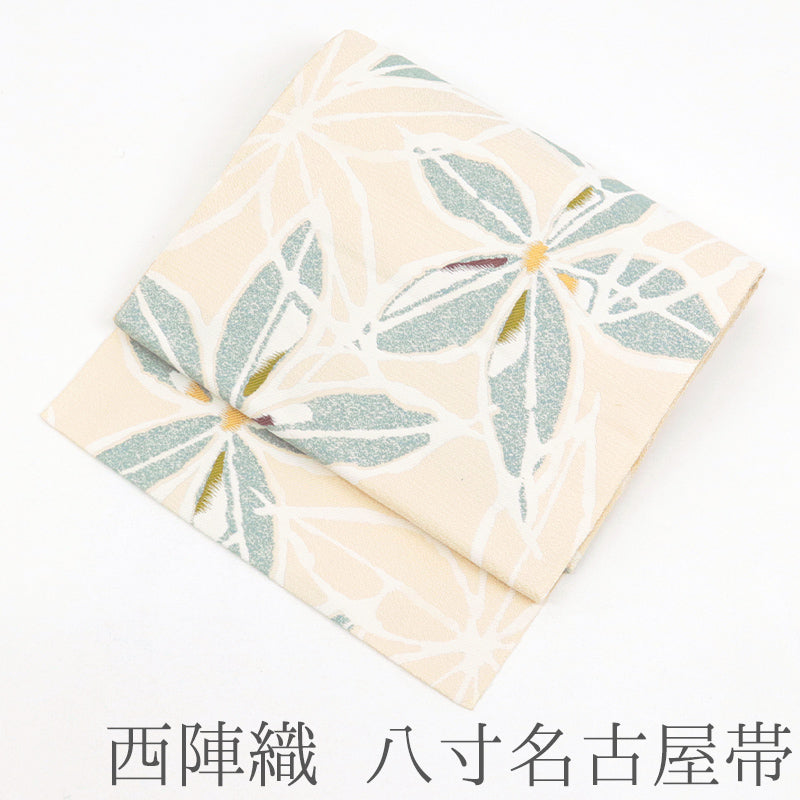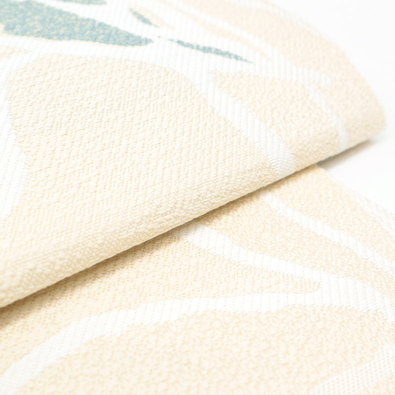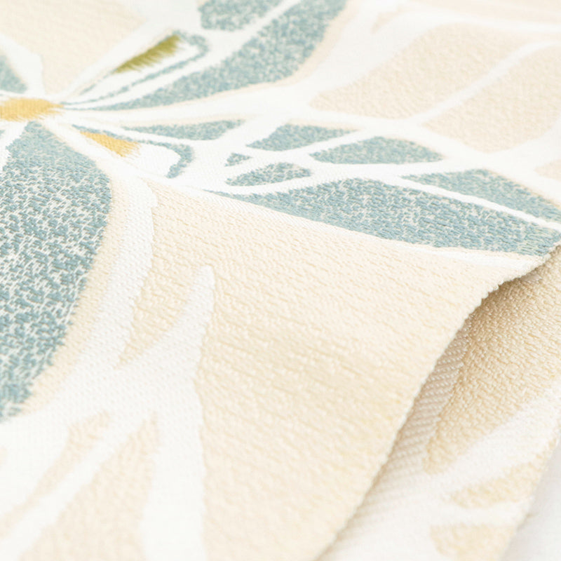 淡いベージュ地に、大きくのびやかに咲く花が描かれた名古屋帯です。柔らかな青緑と白のコントラストが爽やかで、落ち着きのある印象を添えています。