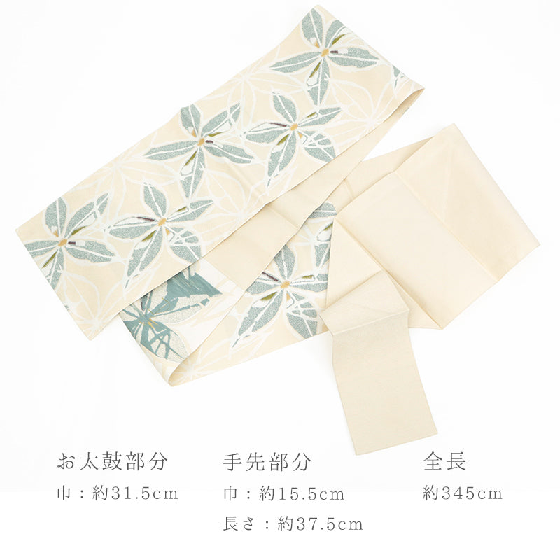 | サイズ | お太鼓巾:約31.5cm 手先部分 巾:約15.5cm 長さ:約37.5cm 全長:約345cm |